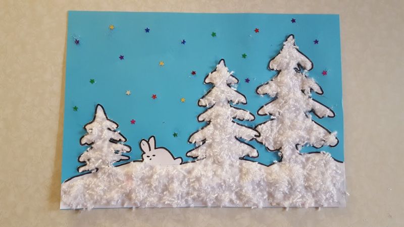 - Трябва да нарисувате зимна гора с коледни елхи и зайче върху син картон.