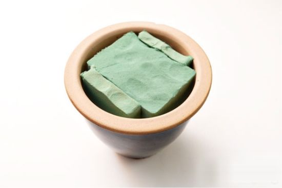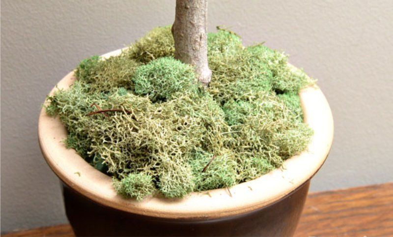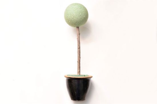 След това разредете мазилката и напълнете саксията с цветя на няколко сантиметра под ръба. Поставете клончето с топчето в центъра и го закрепете, докато мазилката изсъхне напълно. Мазилката може да се "мулчира" с малки шишарки или мъх.