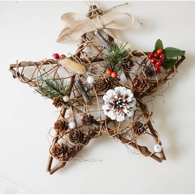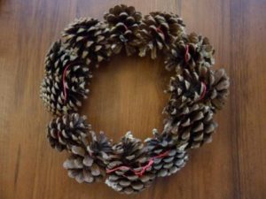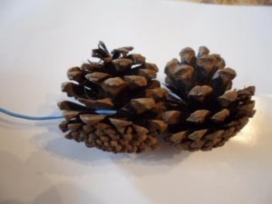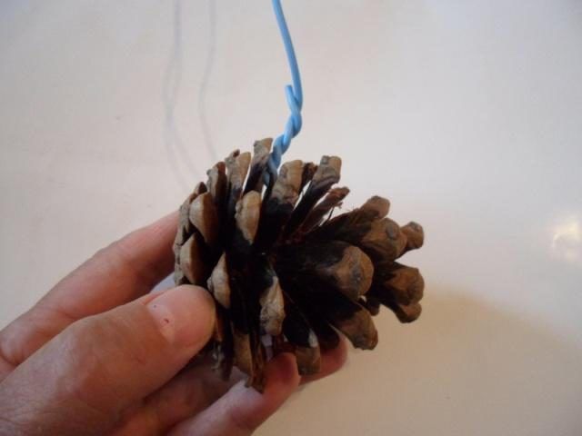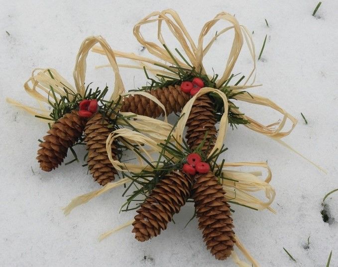 - Сглобете три еднакви обръча от шишарки, скрепени с тел.
