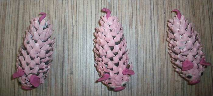 Зрелите борови шишарки са подходящи за този занаят. Тялото на таралежа е оформено от светъл пластилин във формата на голям морков. Поставете върху него очички и носче или фитинги от черен пипер. Шишарките са гъсто разположени по тялото.