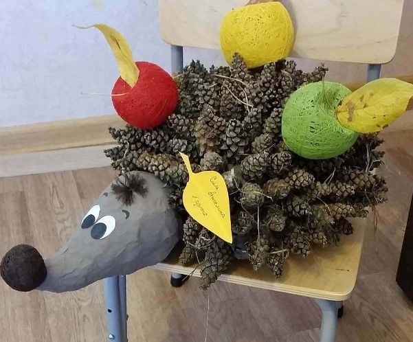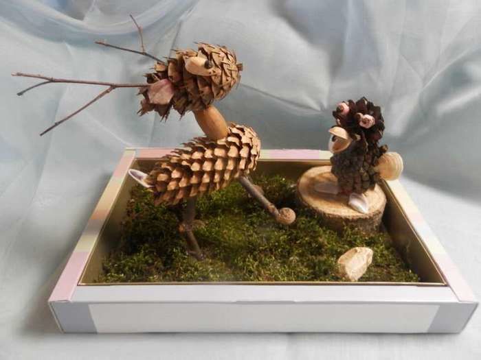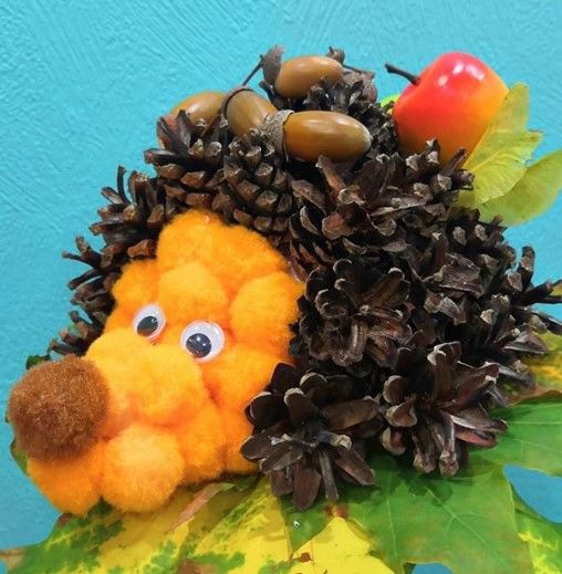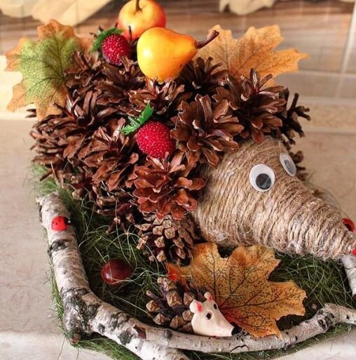 Боровите шишарки се залепват отстрани и отзад на таралежа и след това се пришиват допълнително. Този начин на закрепване на конусите е най-траен. За украса използвайте очи, сушени листа, пластмасови плодове.