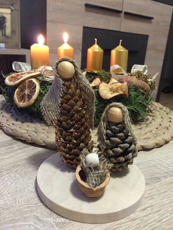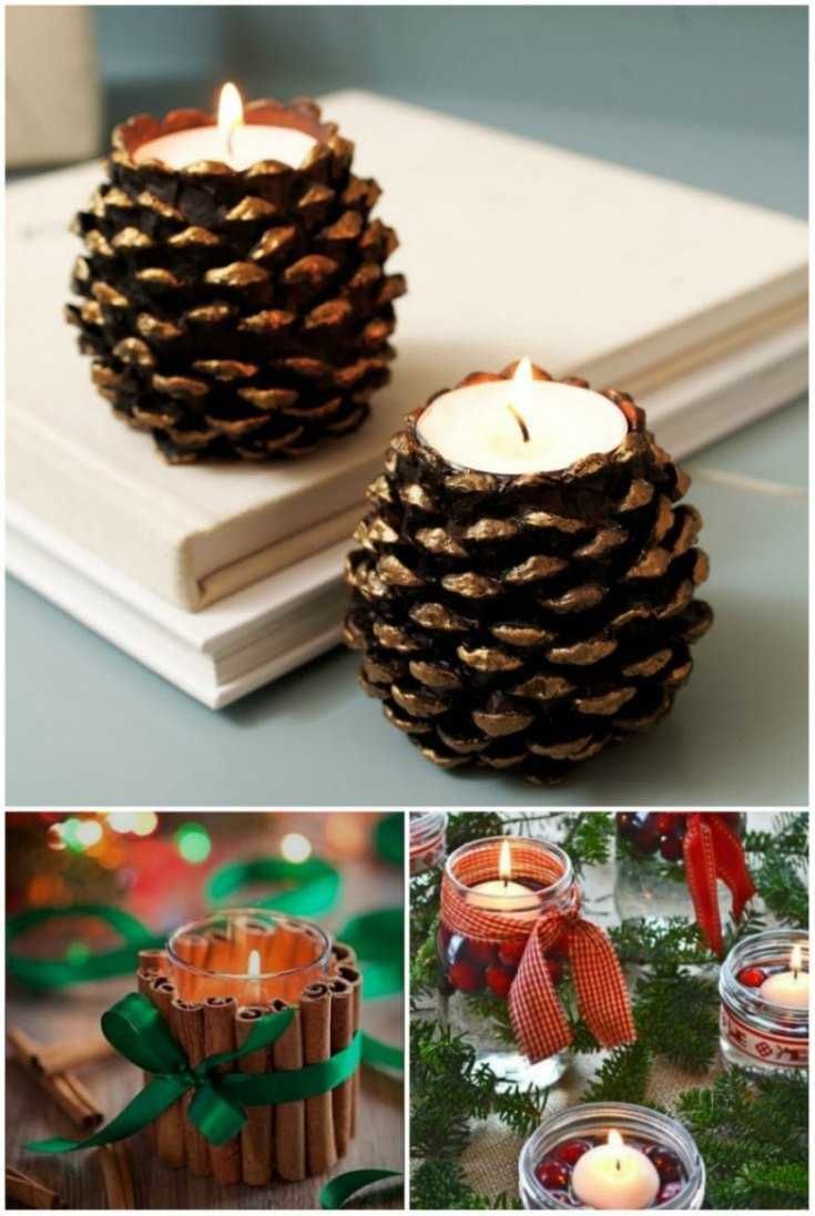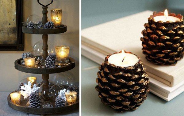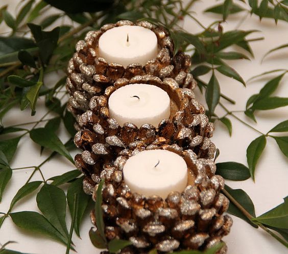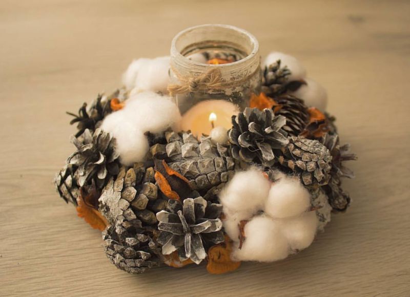 Направете специална уютна вечер, като поставите свещи в тематичен свещник. Не е трудно да се направи от шишарки, картонена основа, спрей и лепило.