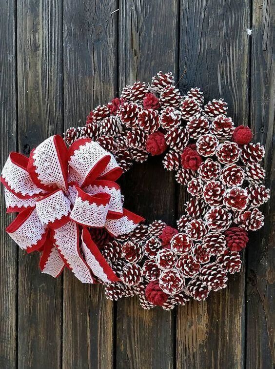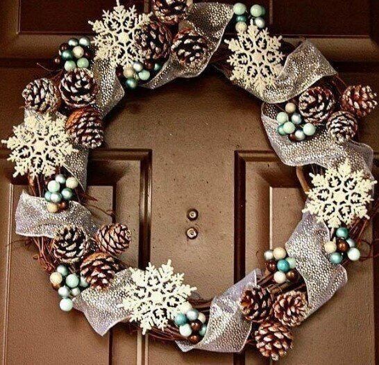 Основата на вестника се маскира с широки сатенени панделки или органза. Украсете венеца с миш-маш или дъга. След това залепете шишарки и други декоративни елементи, като например пластмасови ябълки. Боядисайте шишарките предварително.