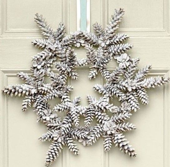 Ръчно изработената снежинка може да се направи за няколко минути. Свържете дълги шишарки от смърч или бор с техните основи. Украсете центъра на снежинката с мънисто или миниатюрна хартиена снежинка.