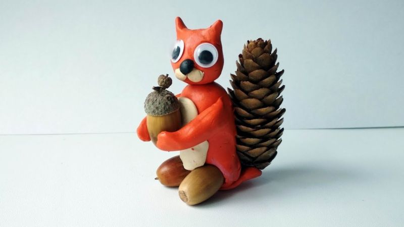 Използвайте бял или сив пластилин, за да оформите главата и опашката му като топчета. Лапите са изработени от същия пластилин. Всички части са поставени на подходящите места. На мястото на ушите се поставят крилца от кленови семена. Очите и носът се изработват от пластилин или се използват аксесоари.