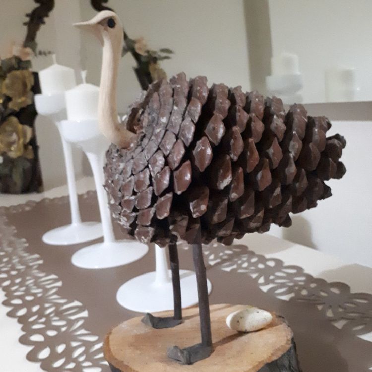 Две средно големи борови шишарки се отварят и свързват върховете си една с друга. Главата е оформена. Прикрепете го към най-големия конус - торса. Залепете към него продълговат конус като опашка. Останалите елементи на занаята са изработени от пластилин.