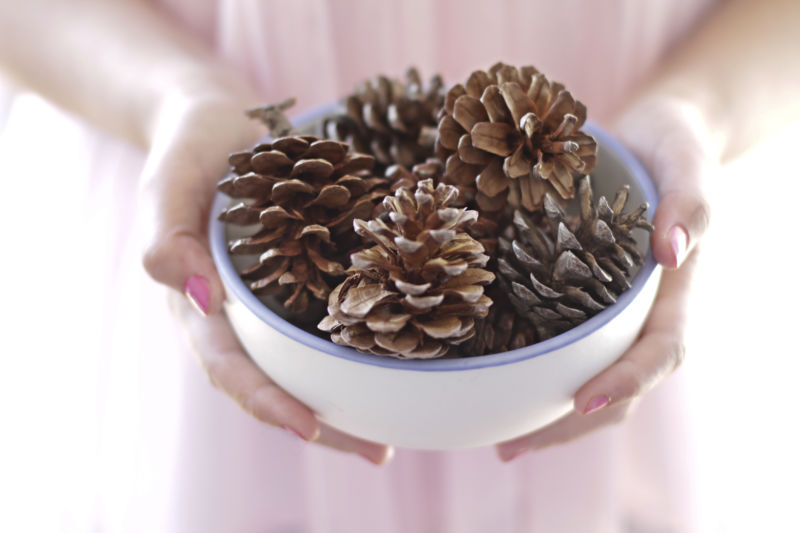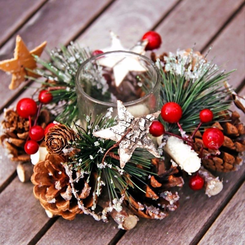 Поставете свещ в центъра на основата, а около нея поставете боядисани шишарки с различни форми. За завършване на аранжировката на свещниците могат да се използват и малки елхови клонки.
