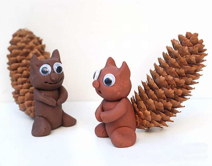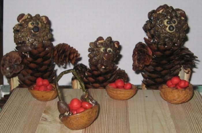 Пухкавата катеричка може да се създаде от голяма кръгла шишарка и 5 по-малки. За да свържете частите, използвайте лепило или пластилин.