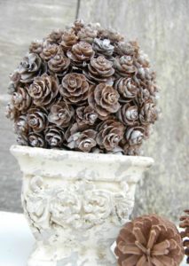 Интересна изработка, която може да се окачи на тавана или да се постави в красива саксия с цветя. За направата на тази топка са ви необходими следните материали: шишарки с приблизително еднаква големина, вестник, найлонова торбичка, лепило и боя със спрей.