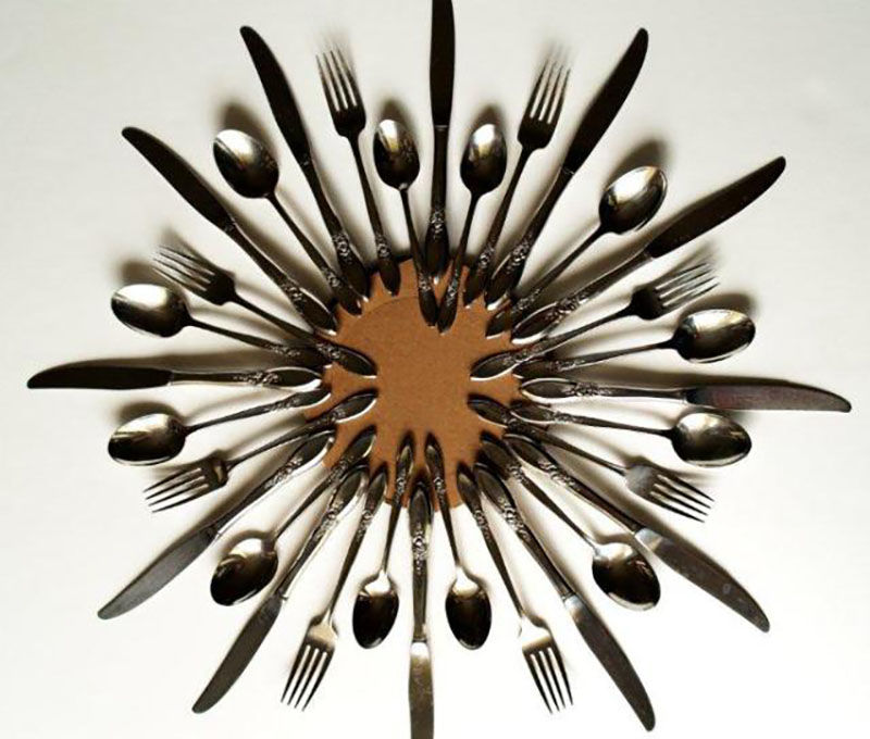 - Подредете приборите за хранене - лъжици, вилици, ножове - около картонения кръг в произволен ред, под формата на слънчеви лъчи.