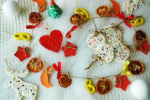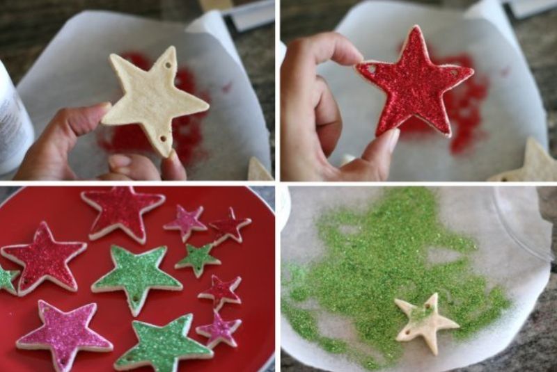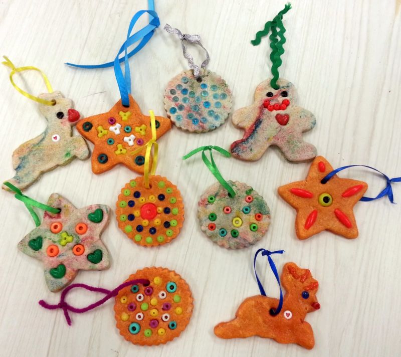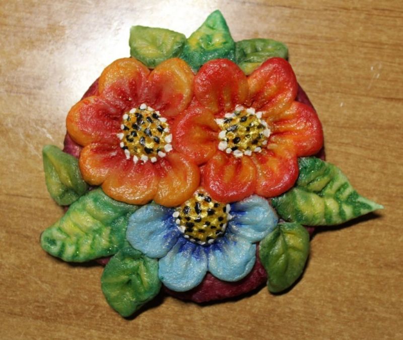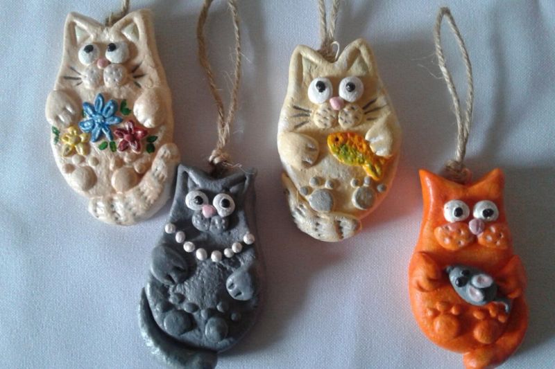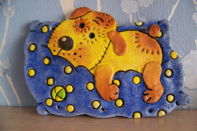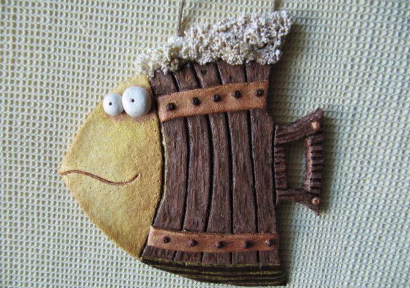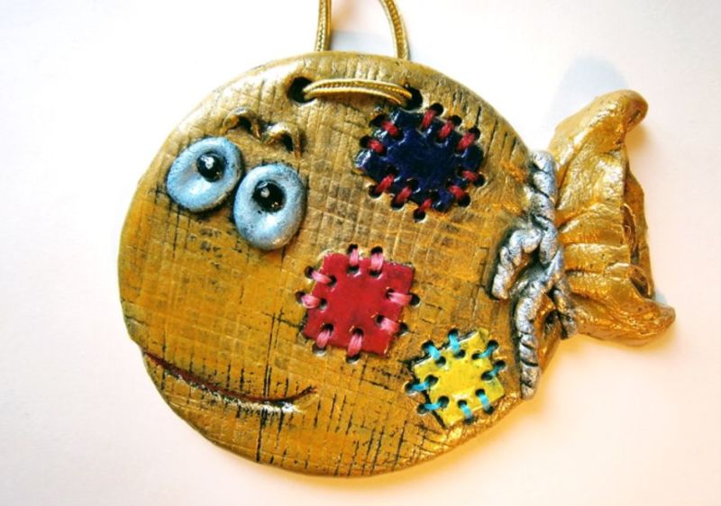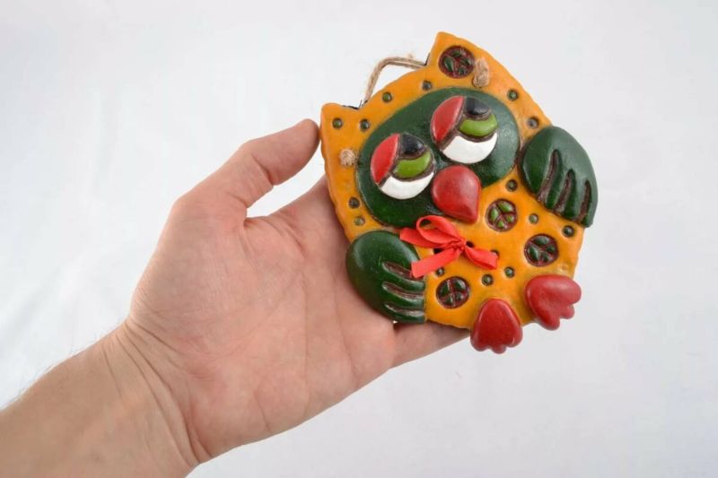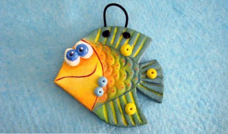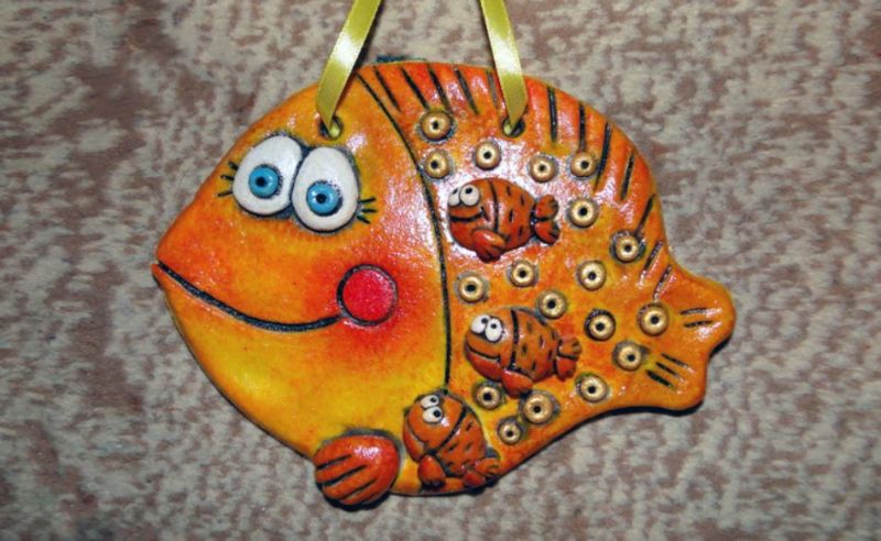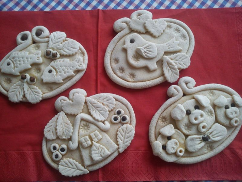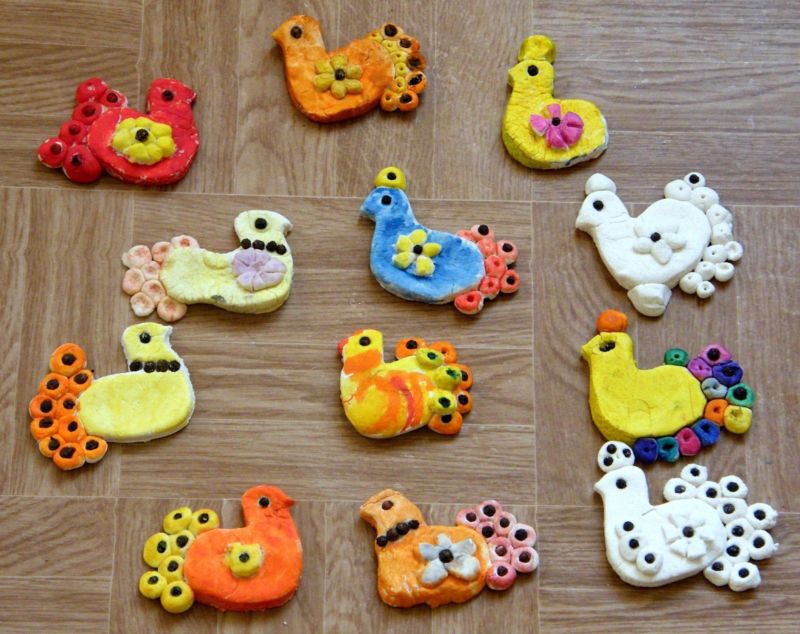 Можете да прикрепите капчици в различен цвят за украса. Остава само да изсушите творението си, да го лакирате и да го оставите да изсъхне. Ако искате да окачите изделията от солено тесто за децата, предварително направете дупка в тях.