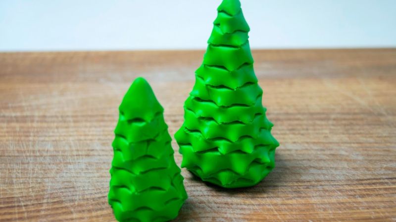 Коледната елха може да бъде пресъздадена по различни методи. Плоският вариант се приготвя с разточен сладкиш. Изрежете контура му, като загладите ръбовете. От тесните ленти в горната част можете да направите примки за гирлянди, като ги притиснете с четка за рисуване. Изрисувайте и украсете дървото с брокат и други декорации.