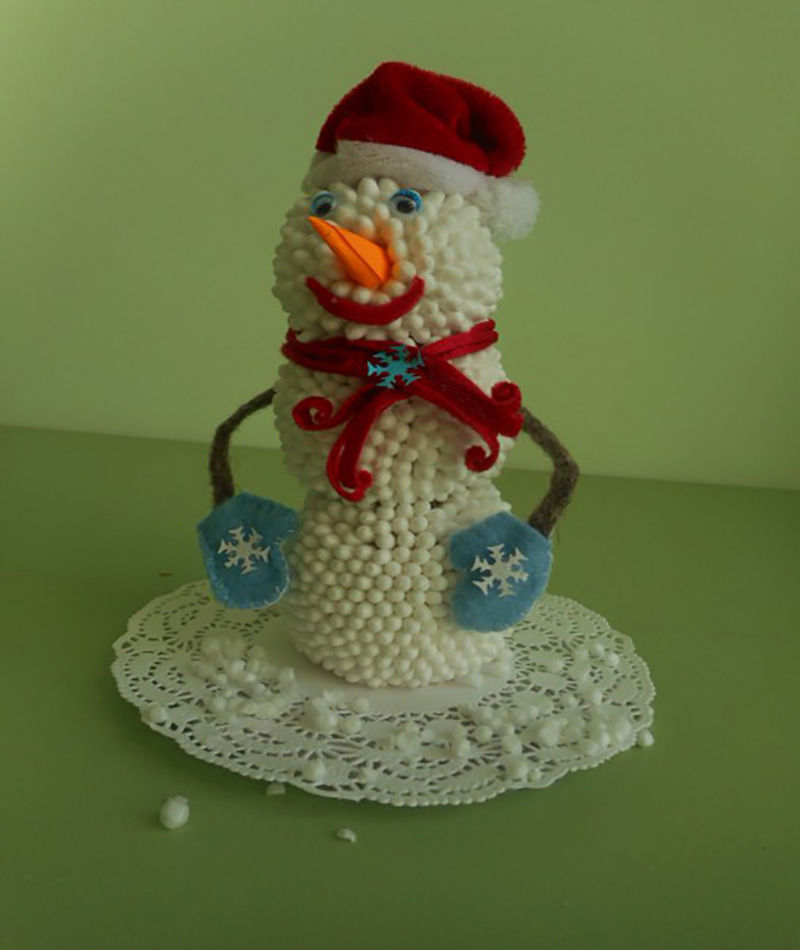 За да завършите творението, снежният човек може да се постави върху бяла салфетка и около него да се залепят топки от пяна. Малките снежинки могат да се използват и за украса на ръкавици, шапка и шал.