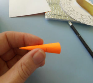 - За целта е необходимо малко парче хартия с оранжев цвят и се прави малък конус. Тя трябва да бъде залепена на първата топка между пръчките.
