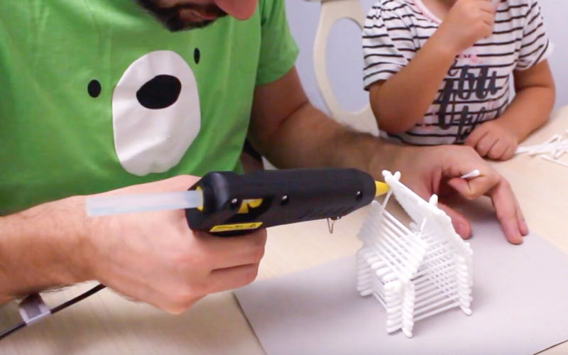 За да се създаде триизмерен ефект, отгоре се използват четири памучни пръчици. За дървената хижа - по две в горната и долната част и по три от всяка страна. От всяка страна може да се добави по още една.