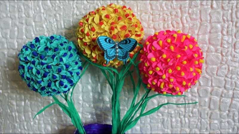 След това те се вкарват в пяната. След като завършите кръга, направете стебло. Необходимо е малко парче тел. Към него е прикрепено цвете. Листата се изработват от цветна хартия с произволна форма. Залепено на лепилото. Готовност за цветя.