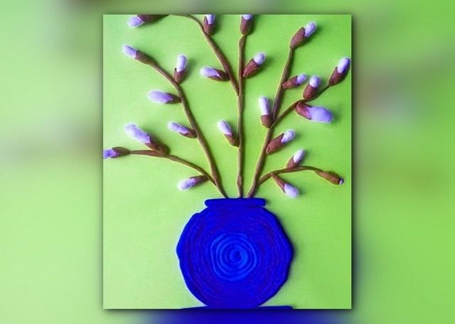 Необходим ви е лист картон, а на дъното направете ваза от пластилин, която да отговаря на всички вкусове. Използвайте наденички от кафяв пластилин, за да направите върбови клонки. Числото може да бъде произволно.
