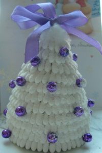 - Телчето може да се украси и със сив филц, за да изглежда по-обемно. Шапката се изработва по преценка. Формата на шала също може да бъде такава, каквато ви харесва.