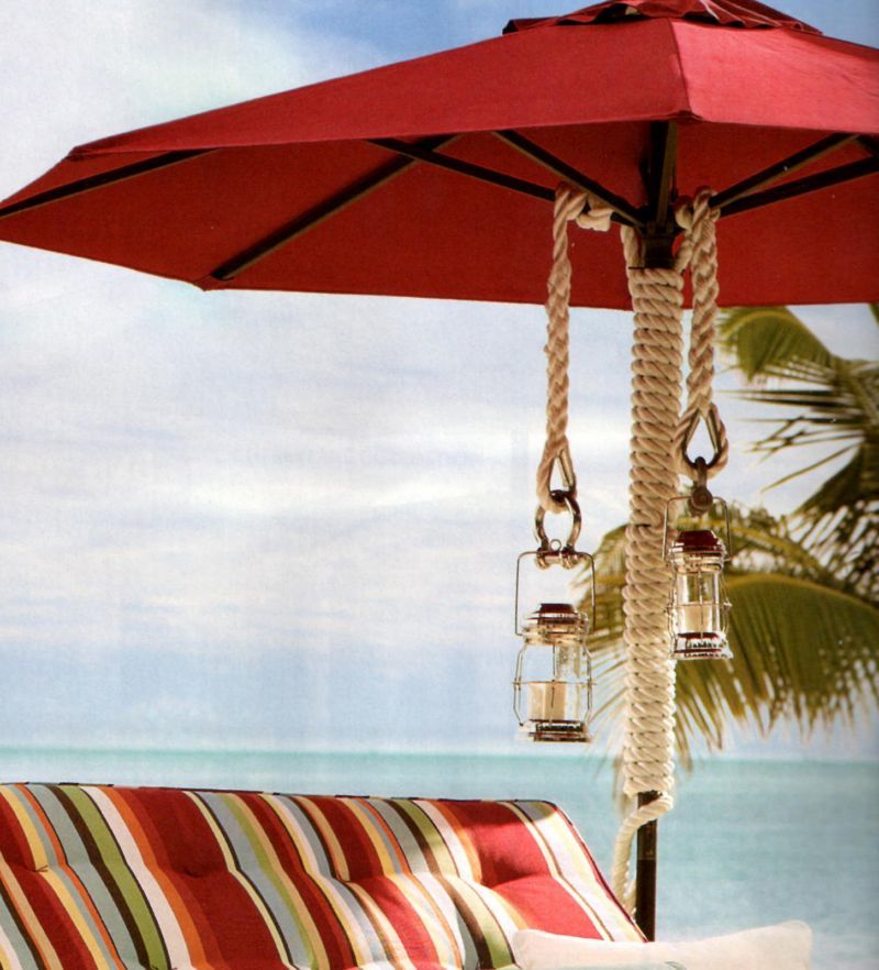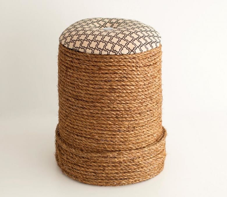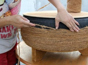 За декорация на мебели, които ще бъдат на открито, е най-добре да се работи със синтетично ленено въже. Той е устойчив на влага и не се деформира.