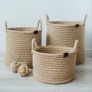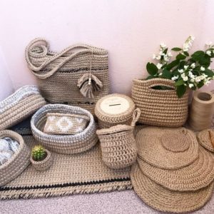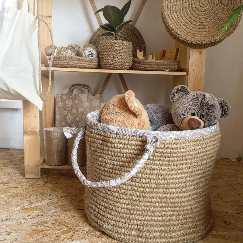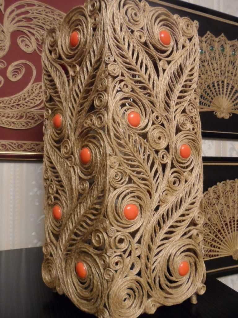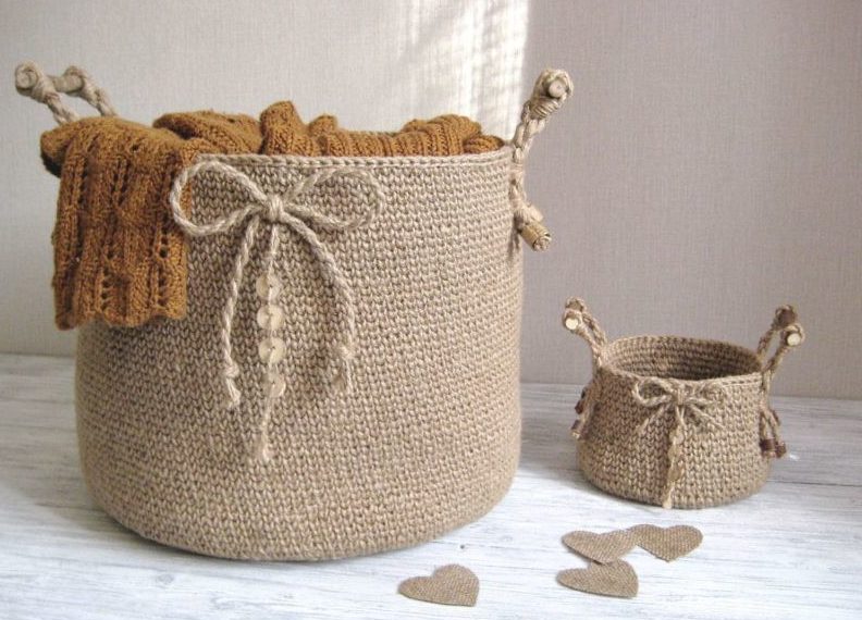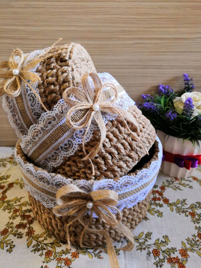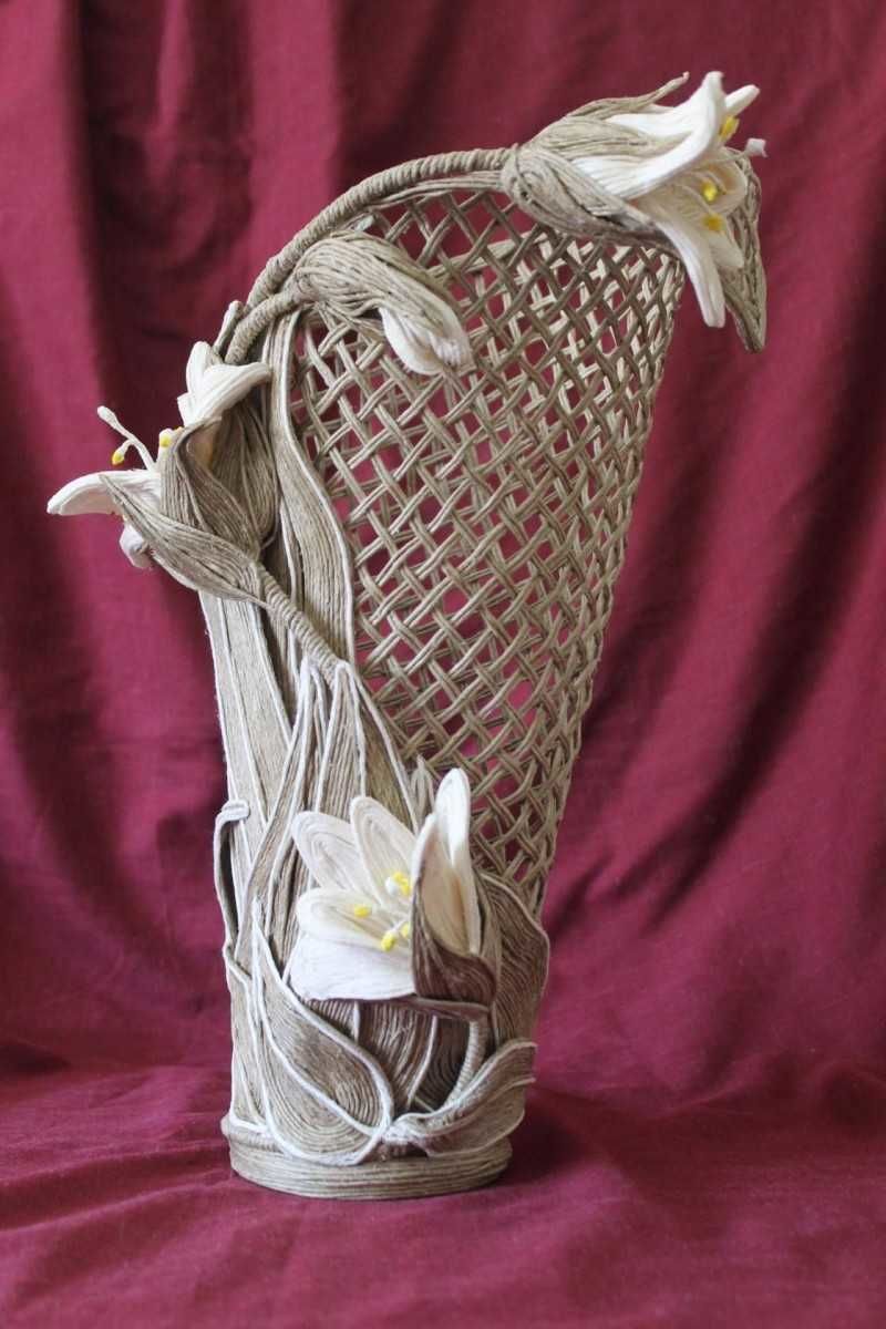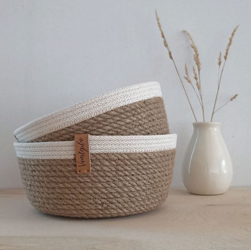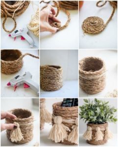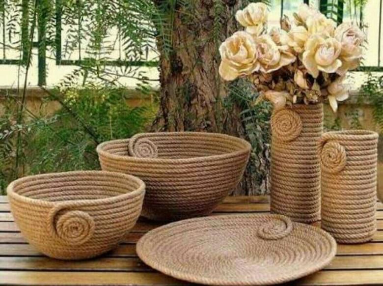 С помощта на въжето можете да изработите огромен брой занаяти за украса на дома и градината, като използвате техники за тъкане, макраме и плетене. Техниката на тъкане може да се използва за украса на вази, рамки, подложки и ковчези.
