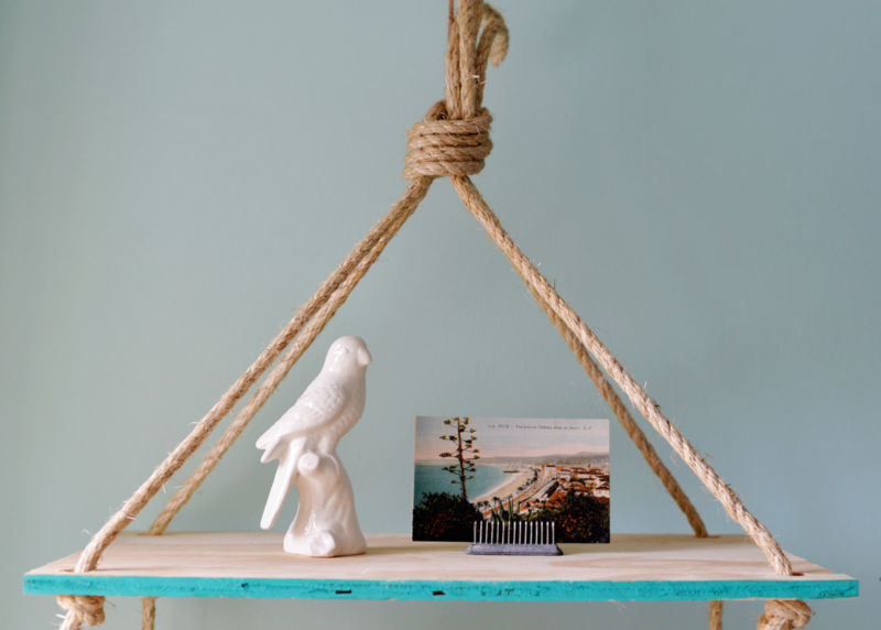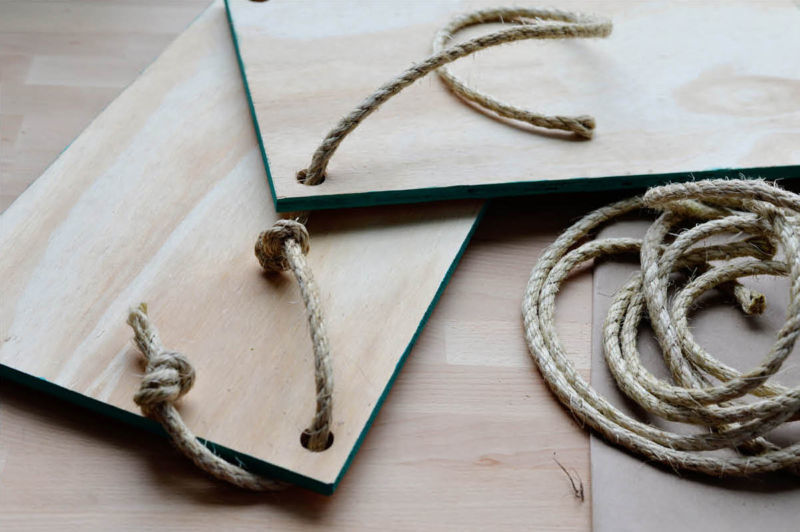 - Стена: Съединете двете дължини на дъските с помощта на метален ъгъл. Нанесете лепило върху дъските и залепете въжето към тях. Закрепете ъгъла към стената.