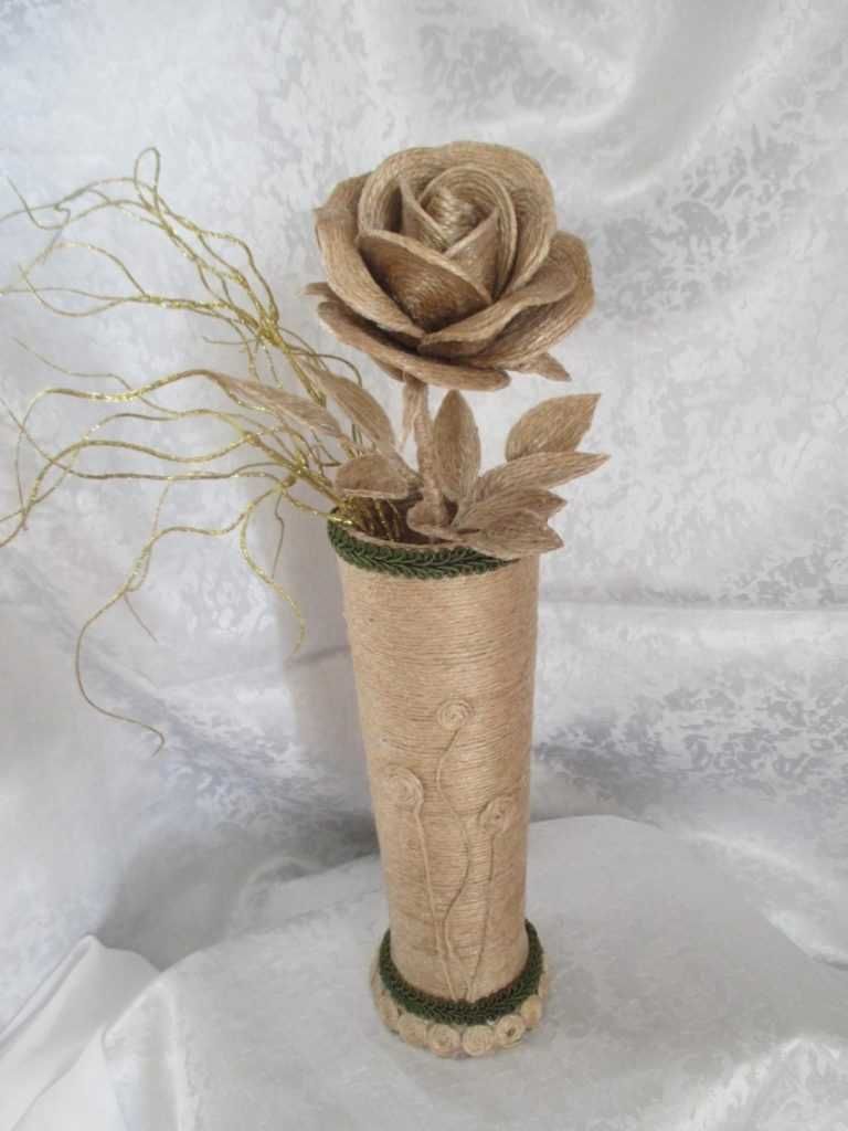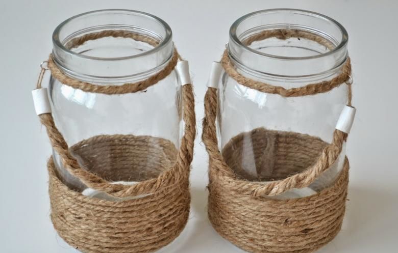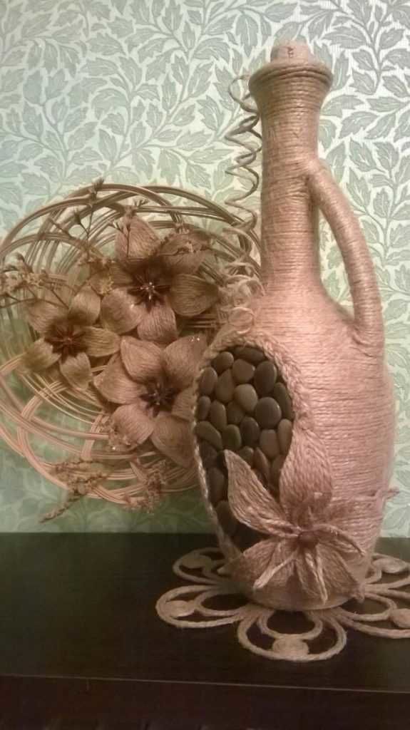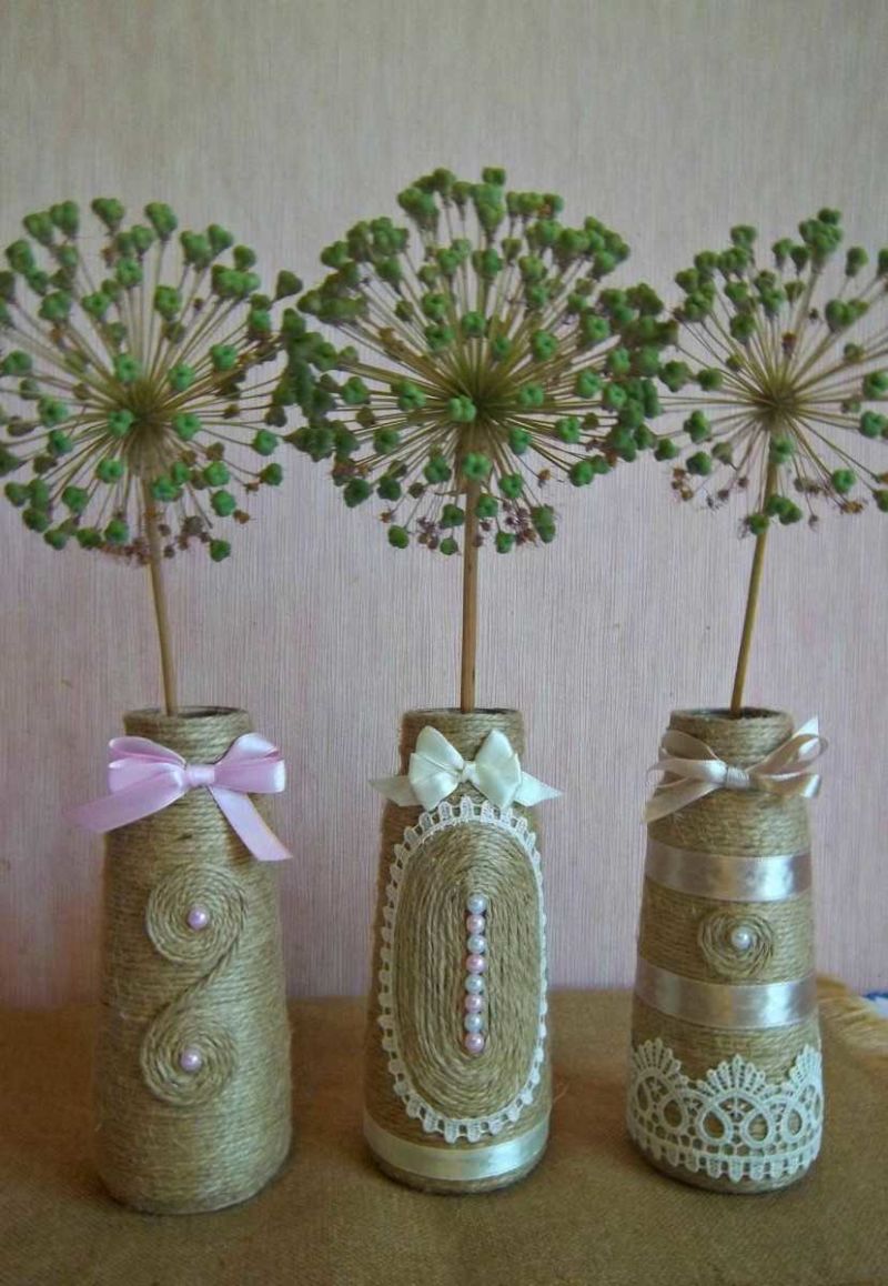 Всяка ваза, от която не се нуждаете, ще изглежда необичайно, ако я премените с канап или панделка. Ако не се вписва в помещението или има малък отломък, можете да отстраните тези недостатъци с въже. По същия начин, както при саксията за цветя, тя се покрива с лепило и се увива около нея.