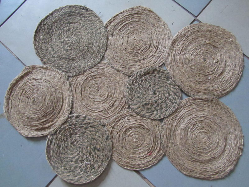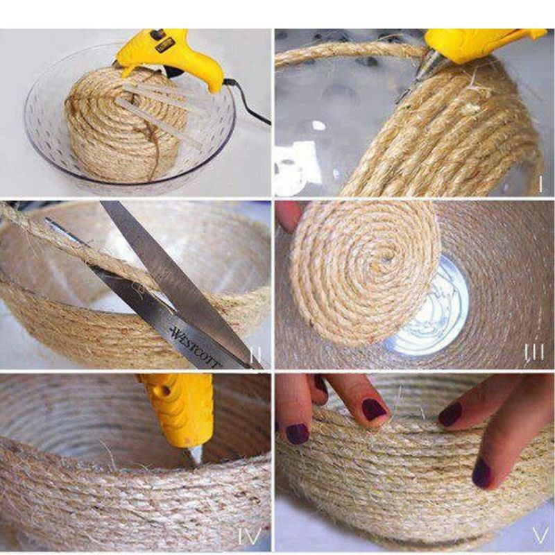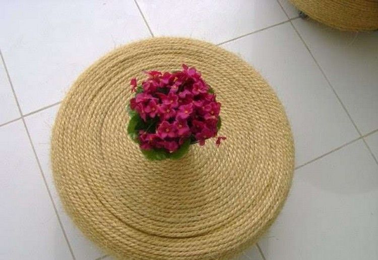 Много удобна е тавата със залепена към нея връв. Покрийте повърхността на тавата с лепило, като се съобразявате с характеристиките на основата. Въжето от юта е залепено спираловидно на дъното. Тавата е лесна за използване, така че можете да поставяте горещите съдове върху нея и те няма да се плъзгат по повърхността.