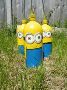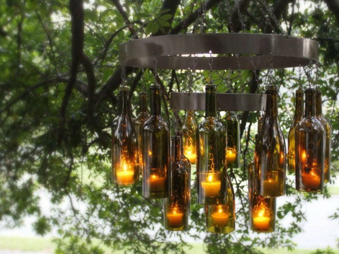 Рециклираните занаяти могат да помогнат за създаването на уютен акцент за вечерно чаено парти в градината. Пример за това е декоративен полилей, изработен от бутилки.