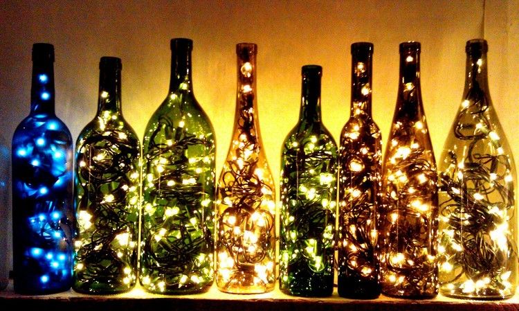 Бутилките могат да се избират от различни цветове стъкло, а също така можете да намерите съдове с интересна конфигурация или с шарка. Тук въображението може да ви бъде от полза.
