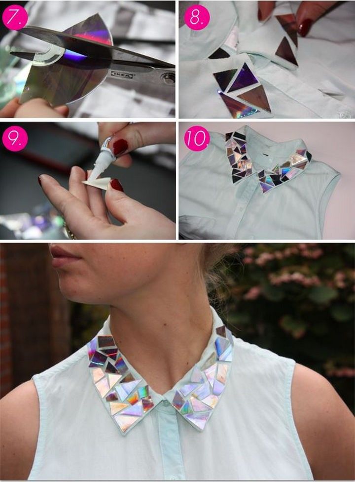 - Аксесоарът вече е завършен. Ако имате стари плоски обеци, можете да ги преобразите и да ги добавите към колието. Просто залепете нарязаните парчета диск върху повърхността им. Резултатът е уникален набор.
