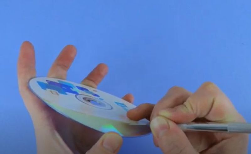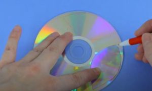 - Направете дупка във всяко парче с остро шило. За по-чист завършек пробивайте от лъскавата страна на диска.