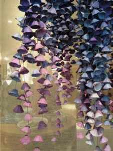 Направете цветята по същия начин, както е описано в урока за венеца за вратата. Внимателно залепете всички листенца, така че нищо да не се разпадне. С помощта на шило направете дупка във всяко цвете, в която след това трябва да нанижете въже.