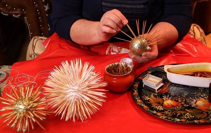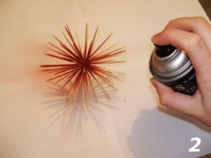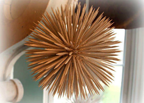 - Намажете единия край на клечките за зъби с лепило и ги вкарайте в дупките. Опитайте се да поставите клечките за зъби на малко разстояние една от друга, като ги подредите на еднаква височина. Така топката ще изглежда много по-подредена.