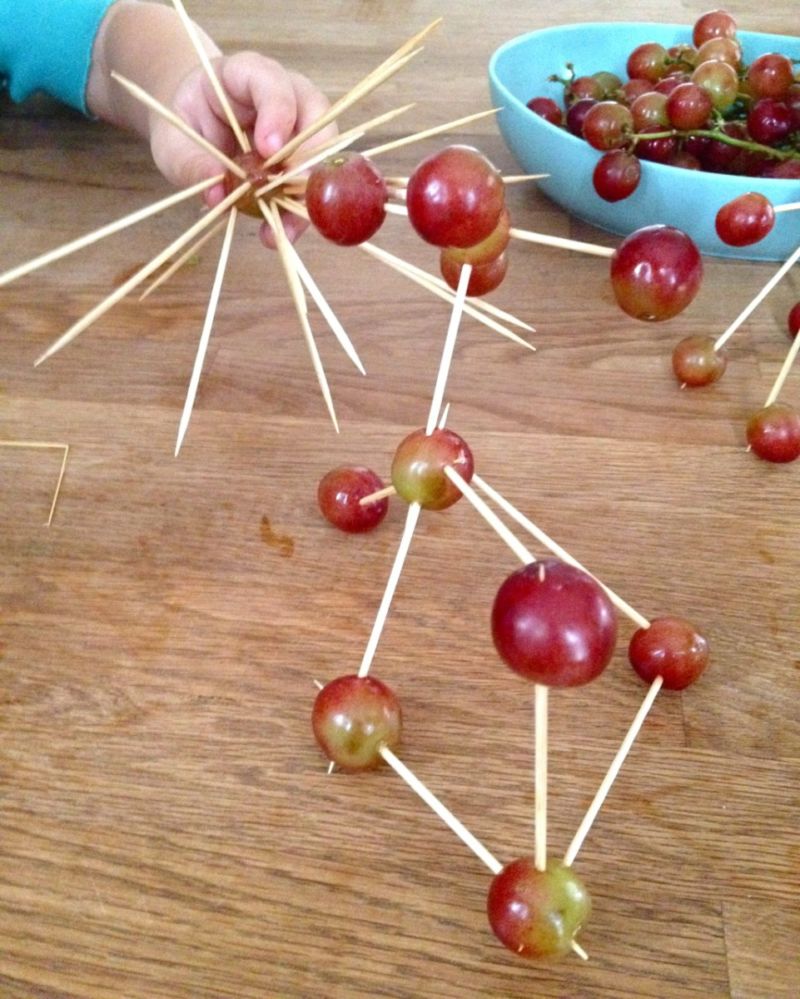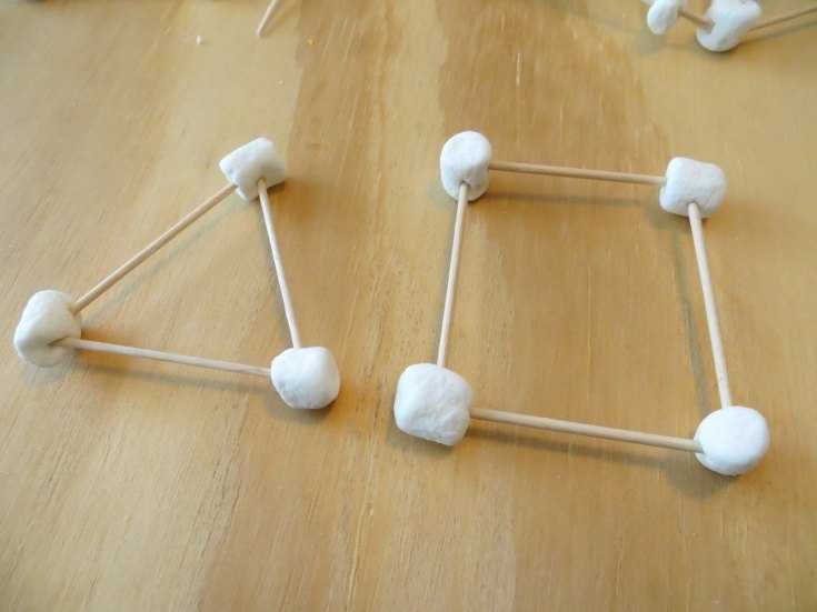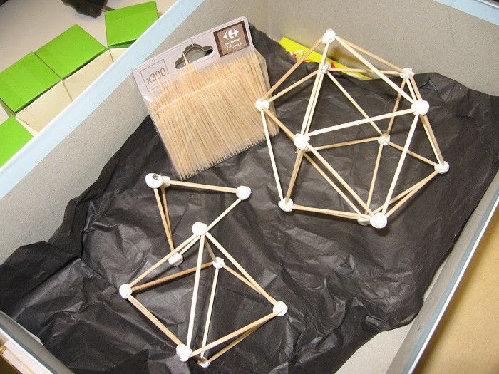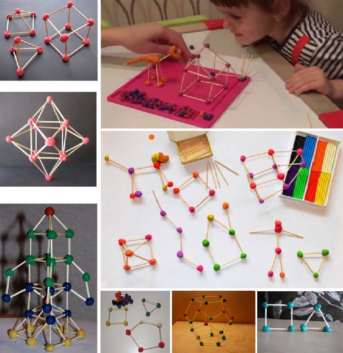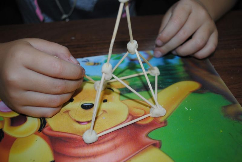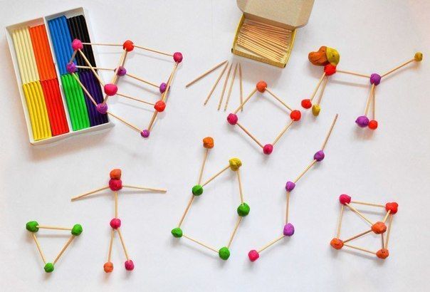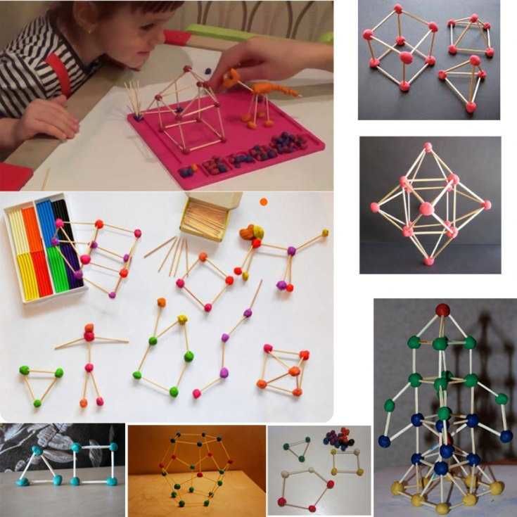 - С помощта на клечки за зъби свържете бучките пластилин. Изследвайте различни геометрични форми: куб, ромб, триъгълник и т.н. Използвайте въображението си! Тази проста техника дава възможност за създаване на оригинални обекти като звезди, човечета, къщи, слънца и др.