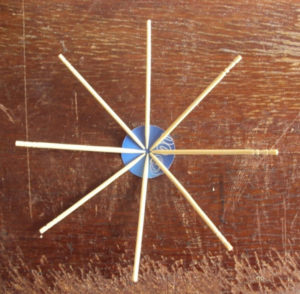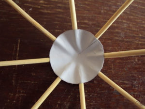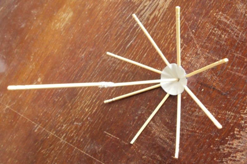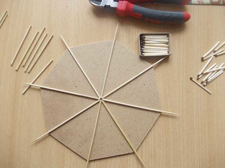 - Изрежете няколко еднакви кръга от хартията. Намажете първата с лепило. Поставете 8 клечки за зъби върху кръга на равни интервали. Залепете второто кръгче и го поставете отгоре, като по този начин закрепите клечките за зъби между двете хартиени кръгчета.