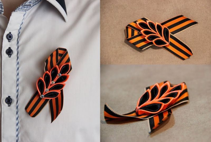 За всеки празник можете да направите със собствените си ръце оригинални тематични апликации с панделки. Изработката на канзаши за 9 май може да бъде гергьовденска панделка с цветя. Такова произведение може да се постави близо до сърцето като символ на победата и уважението към войниците, които са се борили за мир. Или като апликация.