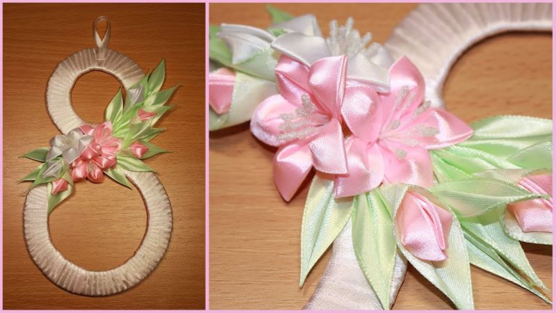 Подарете на майка си или на сестра си поздравителна картичка с канзаши за 8 март и ще я помните дълго. Числото осем може да се направи със сатенена панделка и да се украси с пролетни цветя. Или просто изработете малка кошничка с цветя от панделки като апликация от хартия.