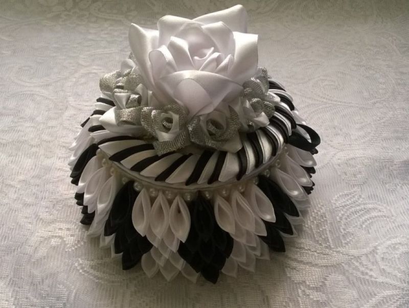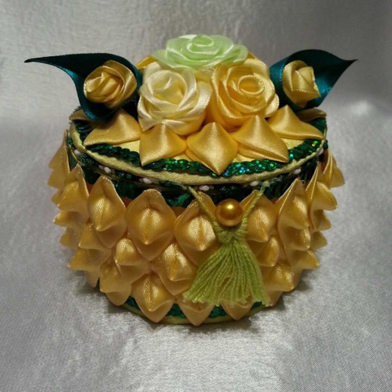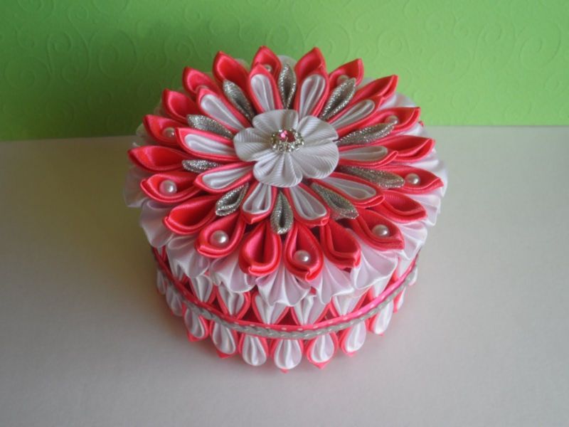 Ръчно изработената кутия за бижута Kanzashi ще украси женската маса. Използвайте го за съхранение на верижки, гривни, пръстени, брошки и гривни. Орнаментите могат да бъдат както скъпи и бижута, така и обикновени бижута.