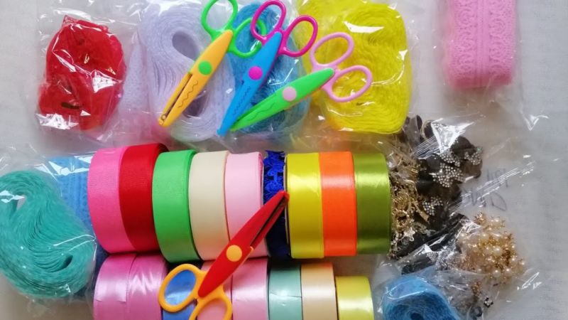- Удобни остри ножици и пинсети с извити краища. По-добре е да имате ножици за плат. А тези оформени пинсети ще ви помогнат да придържате краищата на панделките, докато ги залепвате.