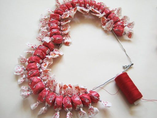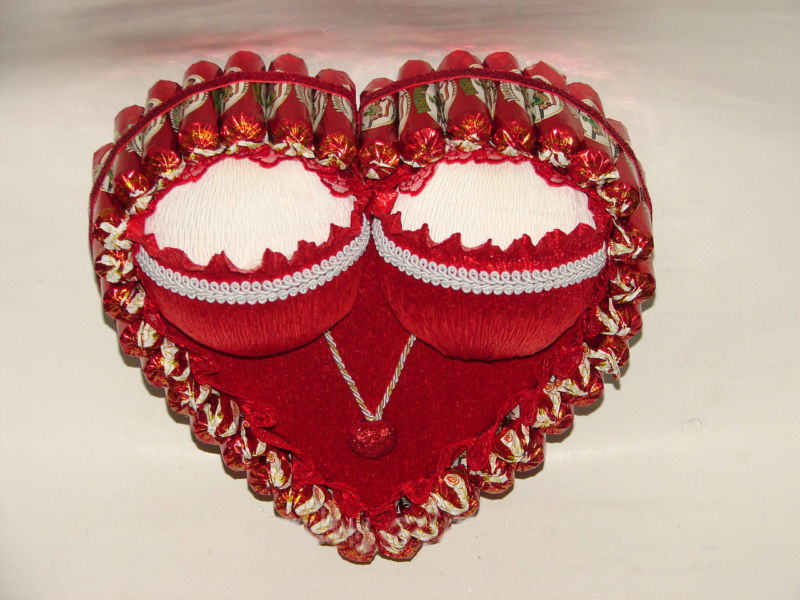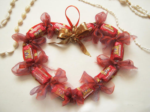 За любителите на сладкото това е идеалният подарък. Трябва да вземете картонена основа, да направите триизмерно сърце и с помощта на пистолет за лепене да го прикрепите по целия периметър на сладките.