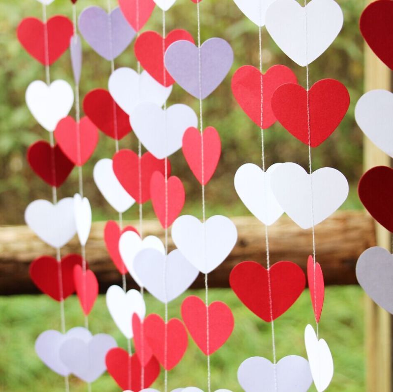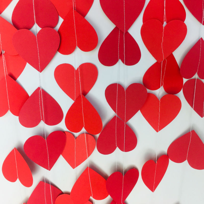 Завеса от сърца. Тук е много просто, трябва да изрежете много малки парчета с желаната форма от червена и розова хартия. След това раздайте равен брой от тях и ги нанижете на конци, като ги окачите на мястото, подобно на завеса.