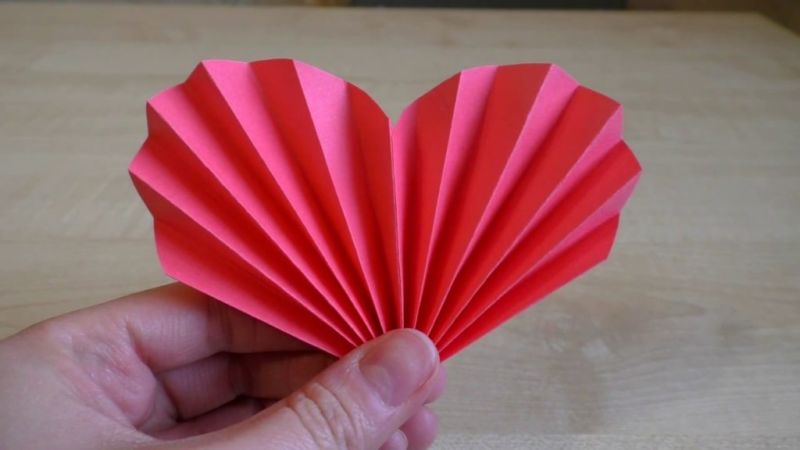Вторият вид ще бъде акордеон: сгънете червената хартия няколко пъти, така че резултатът да е поне три сърца; шаблонът трябва да съдържа само половината от очертания модел и след изрязването му ще има завършена работа.