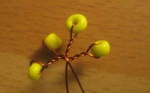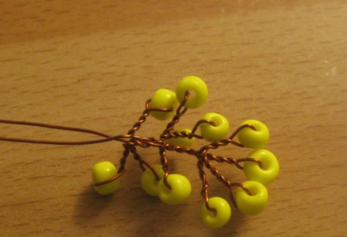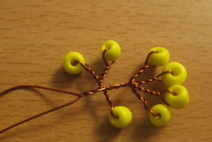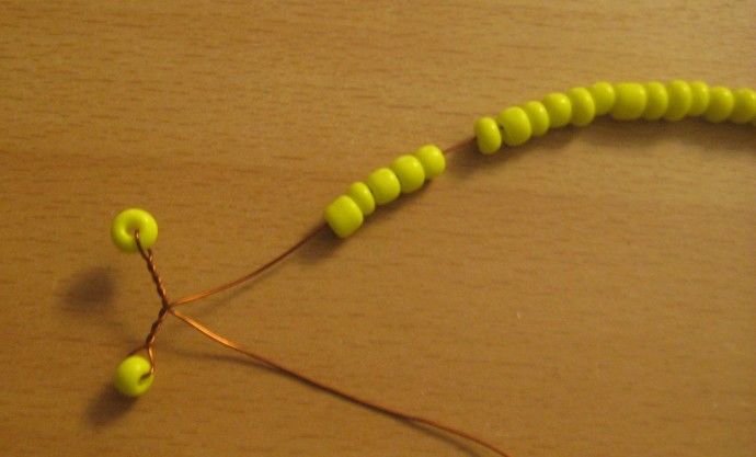 - Върху тел с дължина 48 см поставете 6 жълти мъниста, които трябва да са разположени в центъра. След това усучете жицата под тях, като направите шест завъртания.
