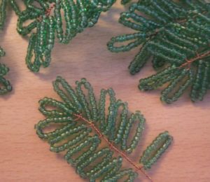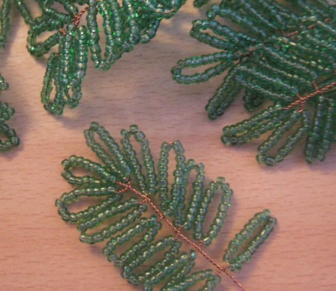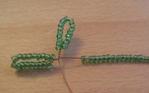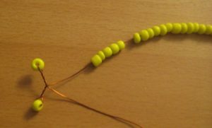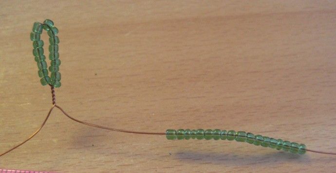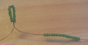 - След това трябва да изплетете листо. На тел с дължина 53 см нанижете 6 зелени мъниста, като ги оставите в средата.
