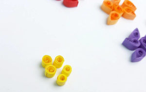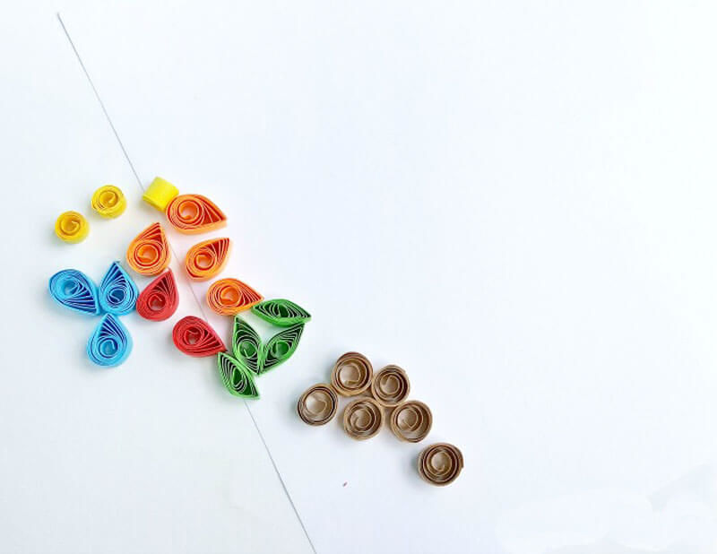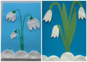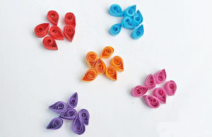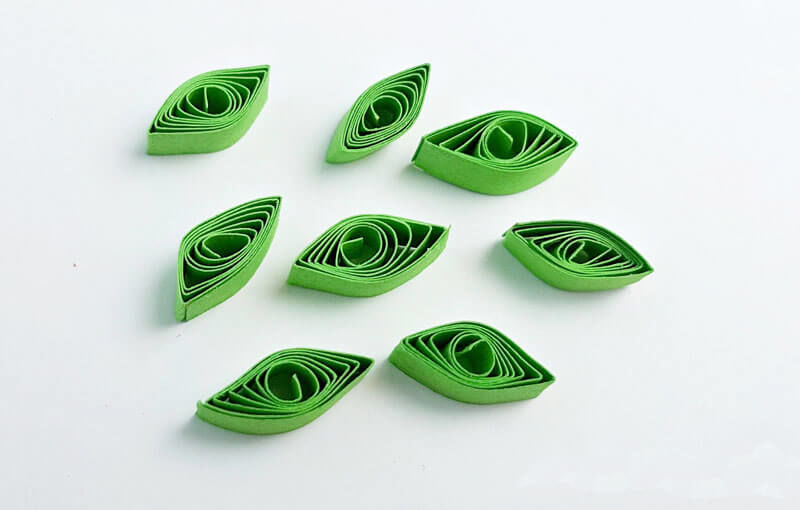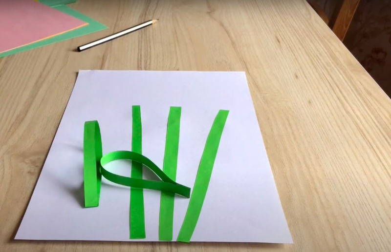- Листовките се изработват по същия начин, но с ширина на лентата 3 мм и зелен лист хартия. Получените капчици са леко огънати, трябва да са 15 броя. Стеблото е изрязано от същия лист хартия.