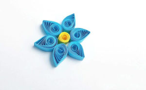 - Шест ленти с дължина 4 см, една по една, се залепват към стъблото на цветето. Отстрани на дъното на лентата залепете друга, върху която в кръг подредете 5 венчелистчета.