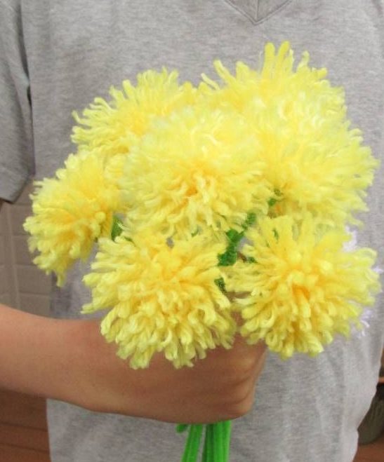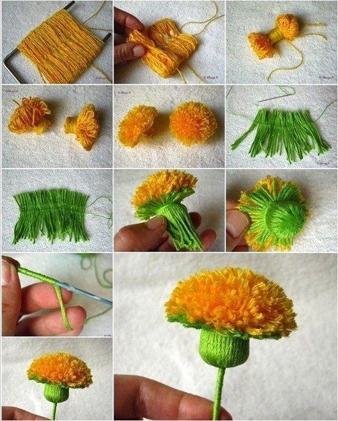 Ако имате много остатъци от вълнени конци у дома, можете да зарадвате жените си за 8 март с цветя от прежда. Друга разновидност на глухарчето: