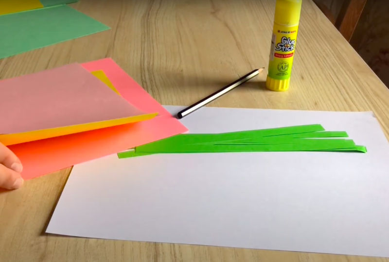 - Върху две парчета с правоъгълна форма 3х10 см от зелена велпапе се изрязва лист.