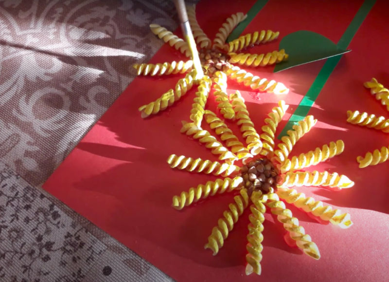 Макаронените изделия все по-често се използват за създаване на занаятчийски изделия. Букет от този продукт ще изглежда хармонично на кухненската маса. Един прост вариант са глухарчетата, които могат да се направят заедно с децата.