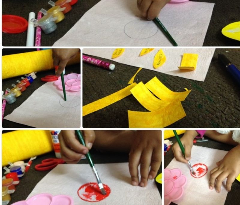 - 3 кръгли ролки са направени от жълта хартия. Това са средните точки на бъдещите цветя. На масата започнете да сглобявате пъпка: 3 листенца с различни нюанси се поставят в кръг и се слепват. Сърцето е залепено отгоре. След това елементите се монтират върху картон.